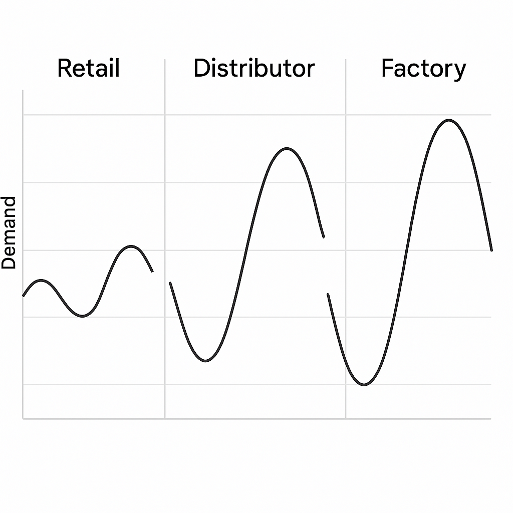 Variance also amplifies as it moves. Supply chains call this the bullwhip effect: tiny demand wiggles at the edge become whip-cracks deep in the network, triggering over-ordering, shortages, and costly corrections. Inside your enterprise, the same dynamic turns a "rare" exception at one node into normal traffic two hops away. Your diagram didn't change; the distribution did.
