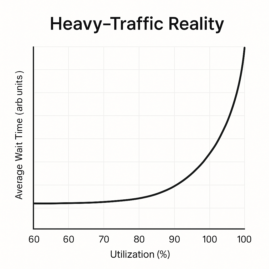 Why does the stall repeat? Because a step-by-step container can't absorb variance. Push your utilization toward "full" and queues tip into heavy traffic: tiny shocks become long waits; work-in-process hides; buffers vanish; cycle time spikes. That's the non-linear behavior Kingman formalized and operations teams still validate—Little's Law linking work in progress (WIP) and cycle time makes the math unambiguous.